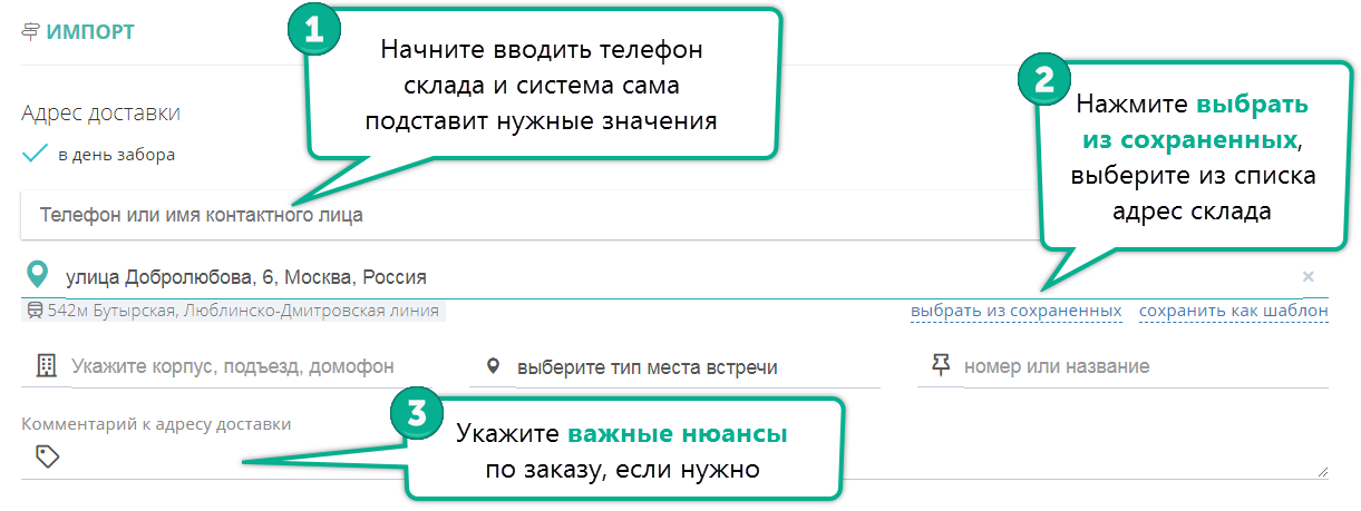 У нас также есть отдельные инструкции Как добавить контактное лицо и Как добавить адрес забора или доставки. Прочитайте их, если не знаете, как это делать.