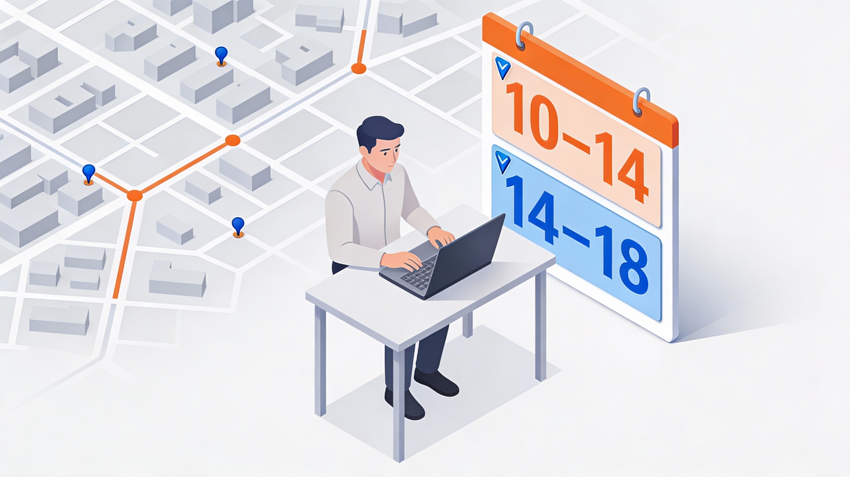 Вы выбираете окна (например, забор 10:00–14:00 и доставка 14:00–18:00), а служба планирует маршрут с учётом времени.